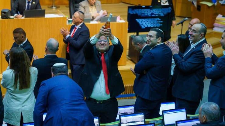 MK Itamar Ben-Gvir, who heads the “Jewish Power” Party and who was convicted on the charge of supporting a terrorist organization pops champagne upon the successful passage of the Death Penalty for Terrorists bill. March 30th 2026
